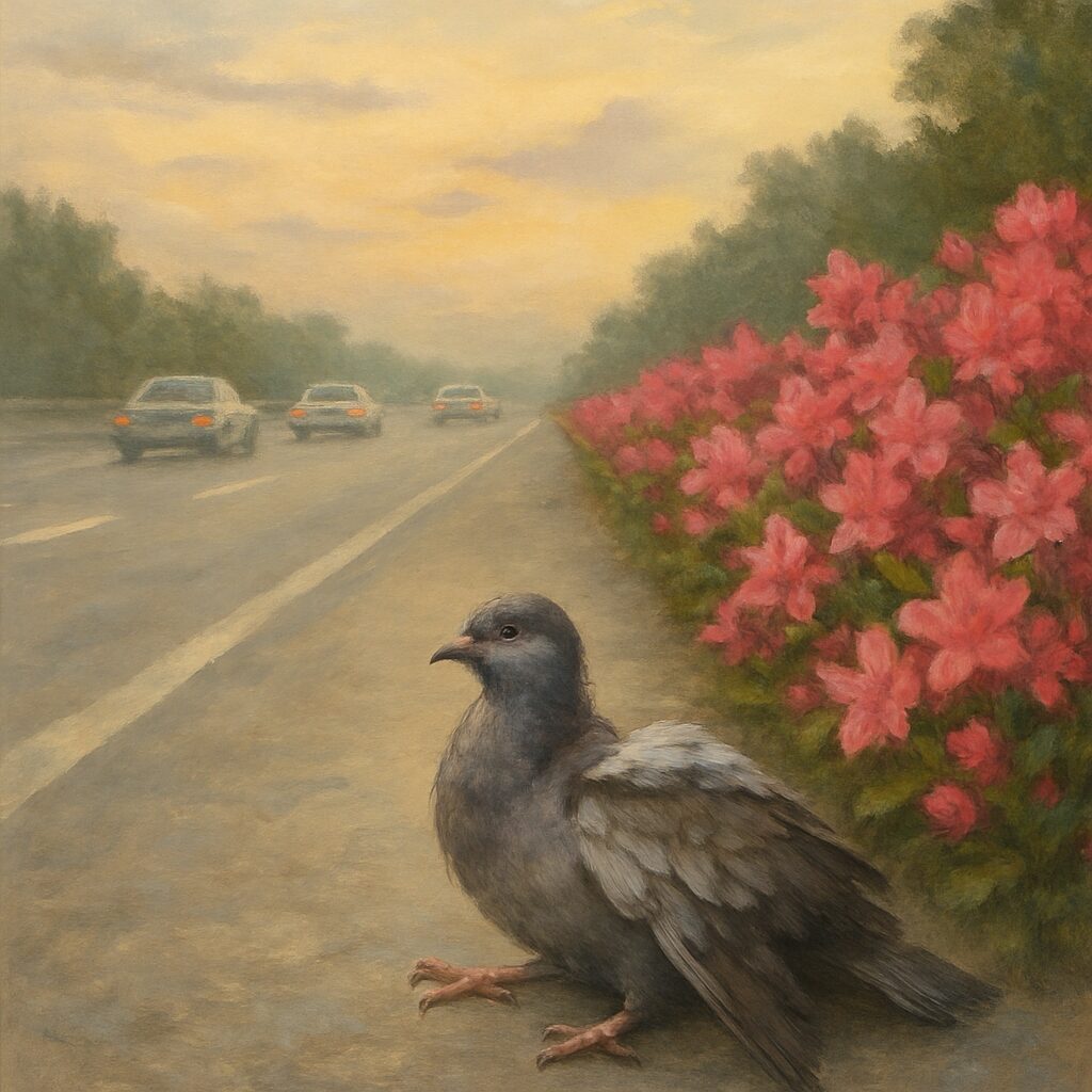길 한복판에 작은 비둘기 한 마리가 있었다.
