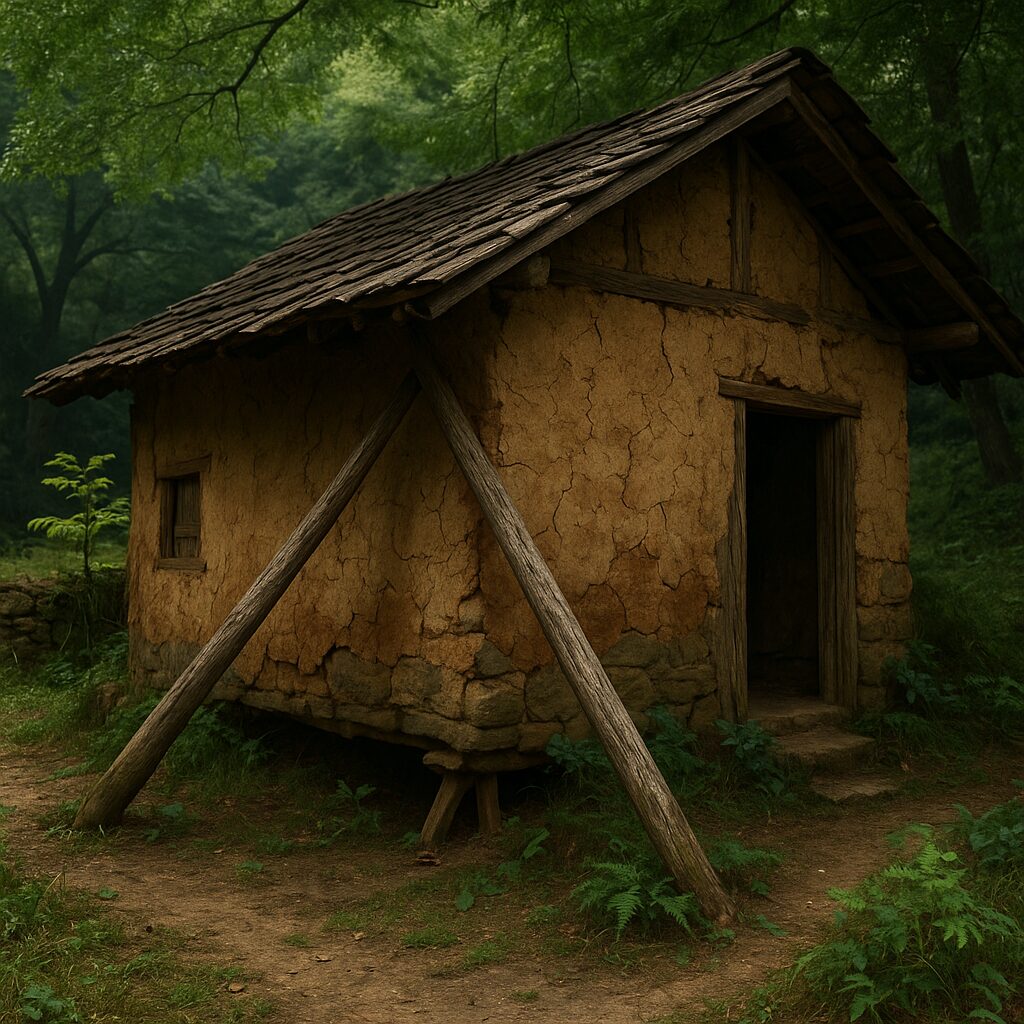 낡은 흙벽집은 지붕이 기울고, 벽엔 오래된 금이 퍼져 있었다.